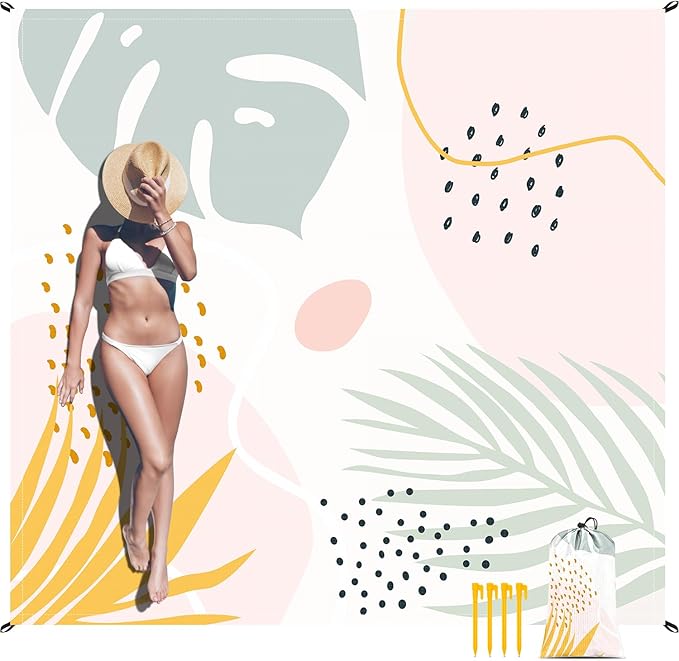 Waterproof Beach Blanket, 78''×86'' Large Sandproof Beach Travel Mat 1-4 Adults, Polyester Lightweight Foldable Outdoor Picnic Blanket with 4 Stakes & 4 Corner Pockets for Grass, Park, Patio