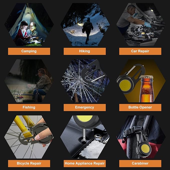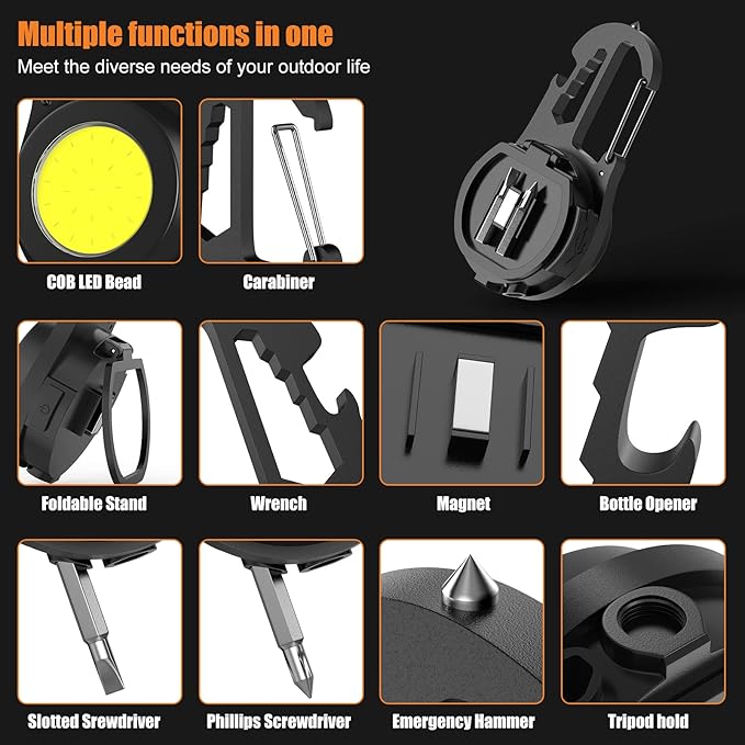 - Multifunctional Small LED Light: A keychain light that integrates multiple functions. This handheld flashlight can be used as a key chain, screwdriver, bottle opener, wrench, emergency hammer, and flashlight. Hang this LED flashlight on your backpack and go outdoors, it will be a good helper for your outdoor activities.