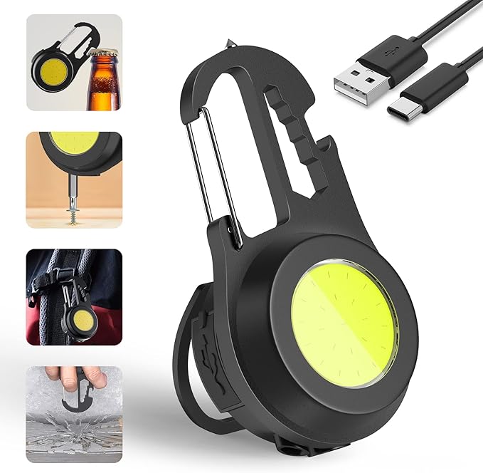 - Rechargeable Mini LED Flashlight: The rechargeable work light is powered by by a 500mAh capacity built-in rechargeable battery. The rechargeable LED flashlight take 1.5 hours to fully charge and last up to 5 hours in low light. You can use this all-in-one magnetic LED light for car repair, hiking, camping, night walks, keychain bottle opener, emergency flashlight, and so on.