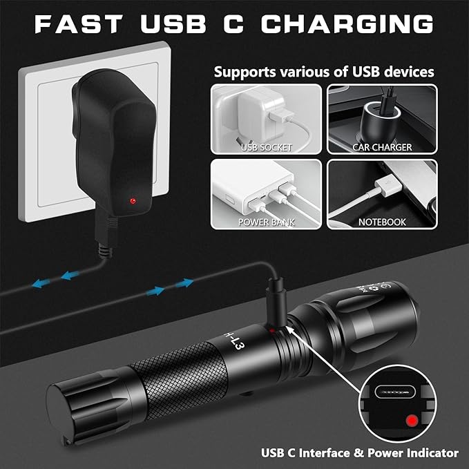 - [ MANY KINDS OF FAST USB CHARGING METHODS ] Push/pull the head,you will find a USB C charging port,put our battery with the white tube into the flashlight,connect the USB C cable with wall charger in your home,or you can connect the USB devices in outdoors such as power bank,notebook. When you are driving, you can connect the car charger to charge it. Usually 6-8 hours is enough, the indicator will turn to green, if over 12hours, stop the charging. For safety, don’t charge it overnight.