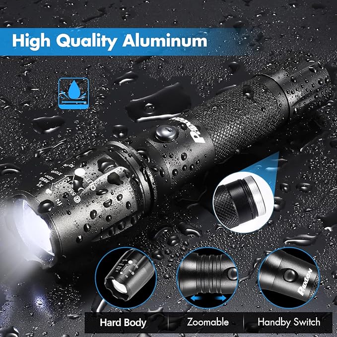 - [HIGH LUMENS SUPER BRIGHT LED FLASHLIGHT]: This LED rechargeable flashlight high lumens is made of high quality & stable LED chip, the brightness can be up to 5000 lumens. It can illuminate an object up to 300 meters away, there is no any problem to illuminate a room of 100 square meters. It is honorable to send it to your friend or family as a gift on Christmas day, Birthday or any other meaningful days.