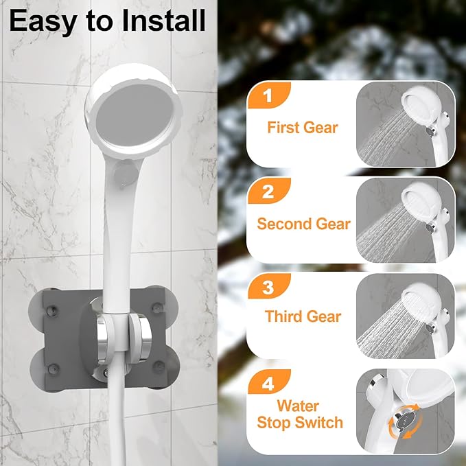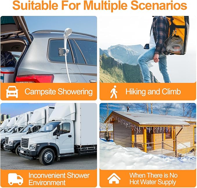 - LONG SERVICE TIME - The Campout shower kit is made of high quality abs engineered plastic material and a noise reduction system that is truly waterproof and durable. It comes with a 6-foot long, thick, eco-friendly hose that resists kinking and a 3-in-1 shower bracket that can be used in a variety of locations. It can also be used as a backup in the event of a water outage.