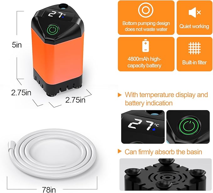 - PUMP WITH SUCTION CUPS - The pump has four small suction cups, which can be attached to smooth surfaces, and will not affect the function of using the pump by pulling the hose and causing the pump to be higher than the water level. The bottom suction design of the shower pump sucks water down to a level below 2.54 inches without wasting water.