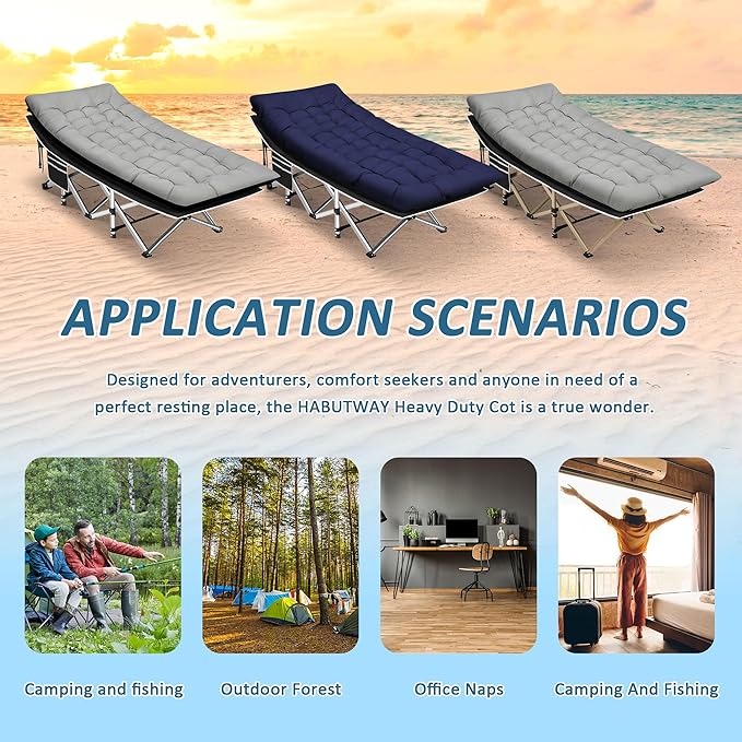 - Heavy Duty Camping Cot: HABUTWAY camping cot is made of high-quality carbon steel. The X-shaped structural frame and 10 non-slip support legs ensure the stability of the camp cot. 600 LBS weight capacity, it's sturdy enough to hold the weight of most adults, an ideal sleeping cot for adults.