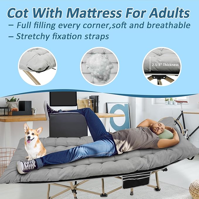- Folding Bed with Mattress: For the most comfortable sleep experience, our sleeping cot deigns with a 2.5-3 inch thick, skin-friendly, material-split mattress. Note: The mattress is removable so you can take it off when it gets too hot.