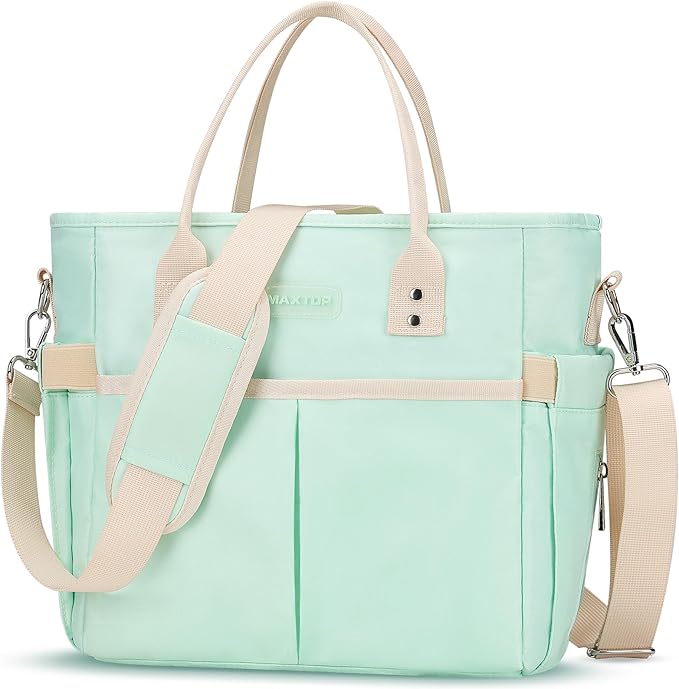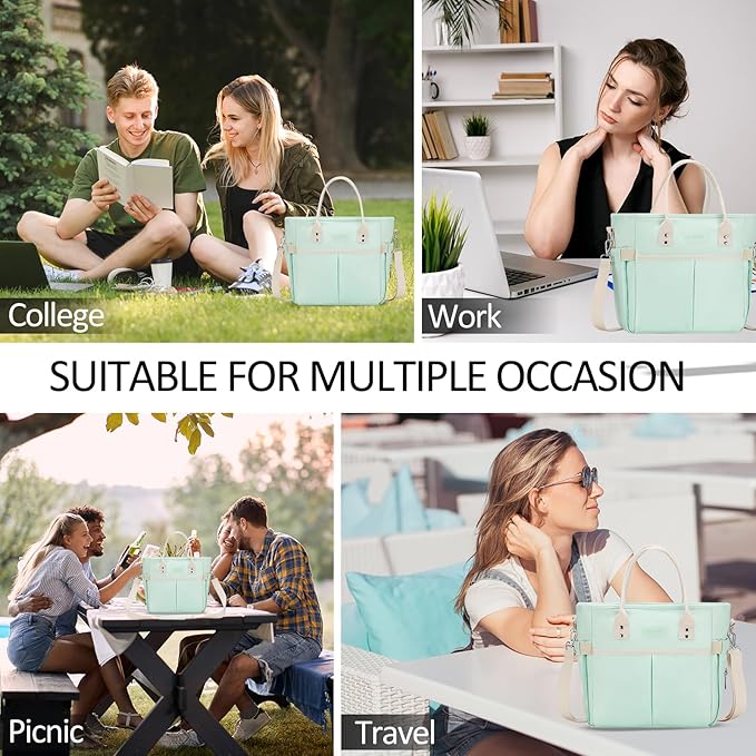 - 【Multifunctional Pockets】- There are 4 pockets on the outside for organizing your personal belongings,making this bag not only a lunch box but also a work bag. Zippered back pocket for cash, cell phone, credit cards,driver's license,etc.Front pocket for iPad, kindle,water bottle,knife and fork.Two side pockets can hold water bottles,umbrellas,napkins.It is an ideal handbag for student,women,work,picnic,and can be used as a cooler bag,diaper bag,grocery bag,etc.