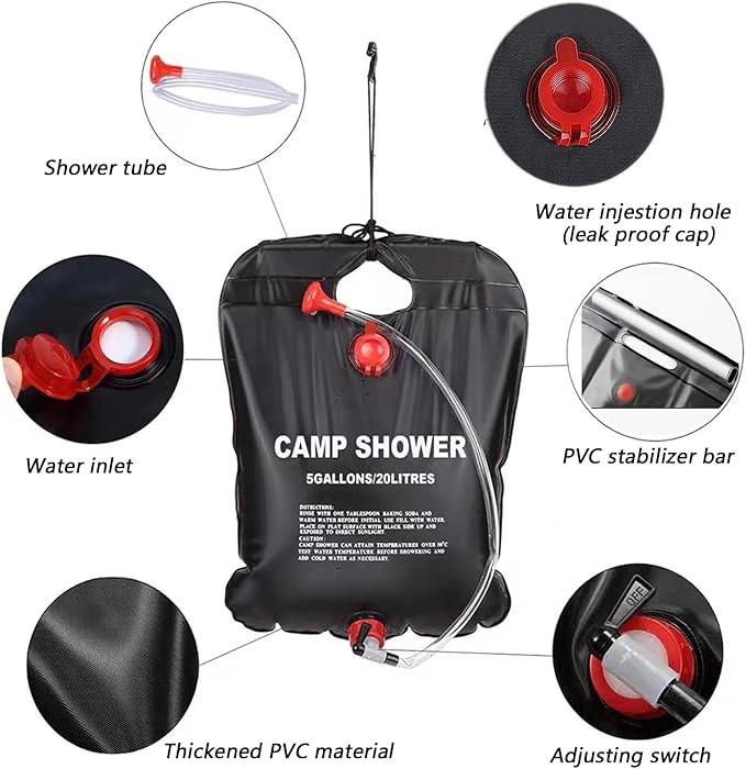 - 【Large Capacity】- You will get 2 pack solar shower bags with a large water capacity of 5 gallons/20L, enough for about 3 showers. The water flow is fine and gentle, bringing you a better shower experience!
