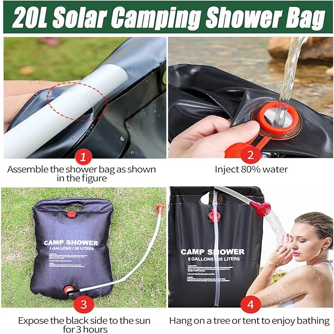- Heat Absorption Design】- Under direct sunlight, the camping shower bag can heat water to 105°F (40°C) in just 3 hours. No need for gas or electricity to enjoy a warm shower outdoors!