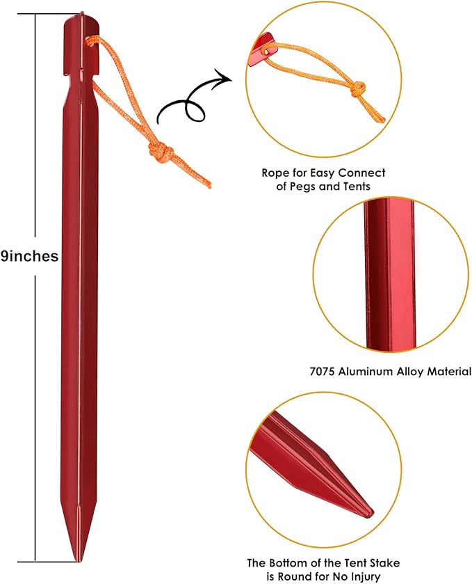 - 4. [ No ACCIDENTAL INJURY ] The bottom of the ground nail is round rather than sharp, and the aluminum tent stakes has a comfortable grip, which can effectively avoid accidental injury.