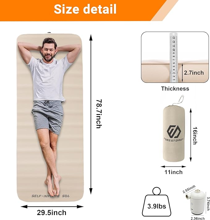 - Ergonomic thickness: Measuring 78.7"x29.5", our air sleeping mattress is spacious enough to accommodate individuals of all body types comfortably.The 2.7-inch thickness ensures you no longer have to endure the dampness and cold of the ground. A slight increase in size yields a significant improvement in comfort. Our foam sleeping pad allows you to stretch out and truly relax after a tiring day.