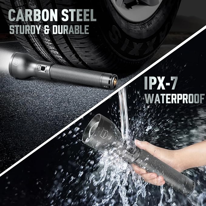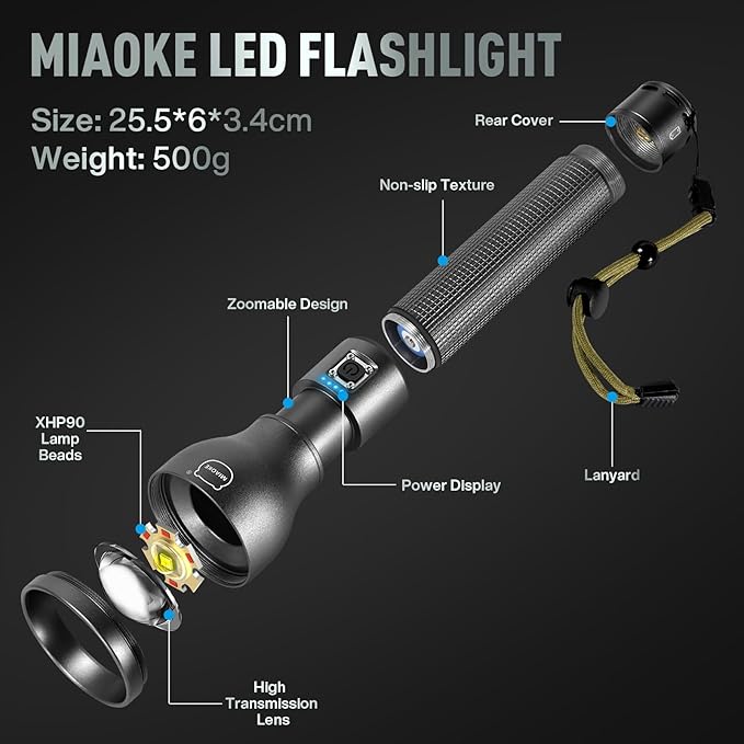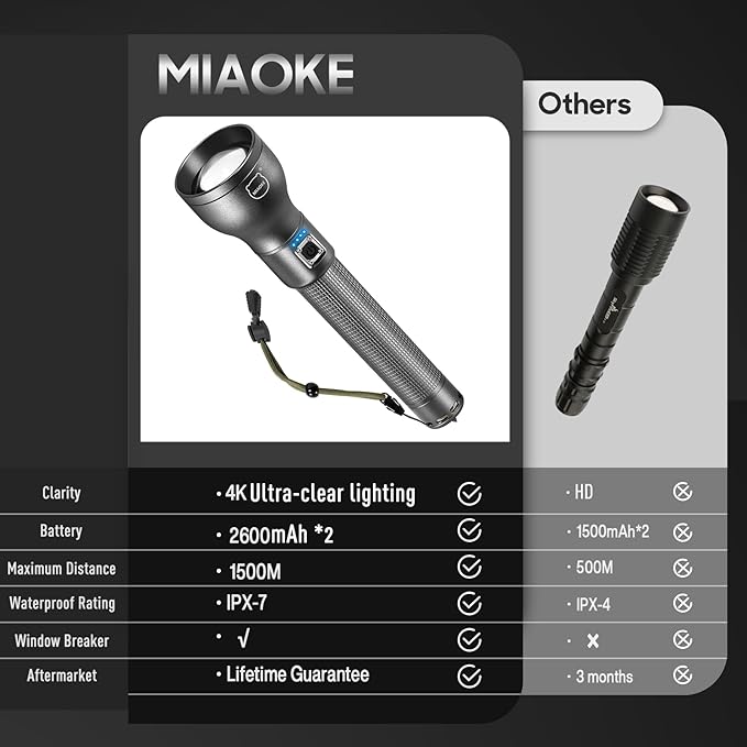- 【Rugged for any High-Intensity Work】 MIAOKE Flashlights with high lumens, extended handle and surface texture for better grip, black steel stone attached to the tail for emergency escape design, full-body hard steel metal, creating a sturdy and durable ultra-high-quality, IPX7 Waterproof suitable for any adverse stormy, snowy weather, forest fire escape, camping, search and rescue, and night lighting needs.