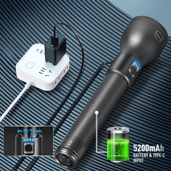 - 【Type-C Fast Charging and Power Display】Flashlight features an exclusive design of Type-C USB fast charging port, which is 3 times faster than ordinary charging interfaces on the market. It also incorporates reverse connection protection, overvoltage protection, and short-circuit protection boards, ensuring a longer lifespan for the flashlight. In addition, it has a 25%/50%/75%/100% battery capacity display function, providing a clearer understanding of the remaining battery charge.