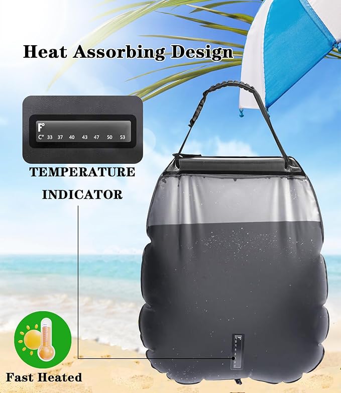 • ★【Heat Absorbing Design】This solar shower bag is made by environmental friendly and leak proof materials which are safe to human health. It heats water to 113°F (45°C) in 3 hours with direct sunlight.It is best to use the water in the outdoor shower bag when the temperature is below 50 degrees to avoid scalding yourself.