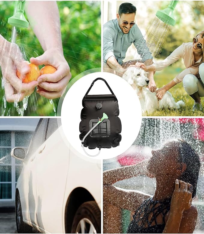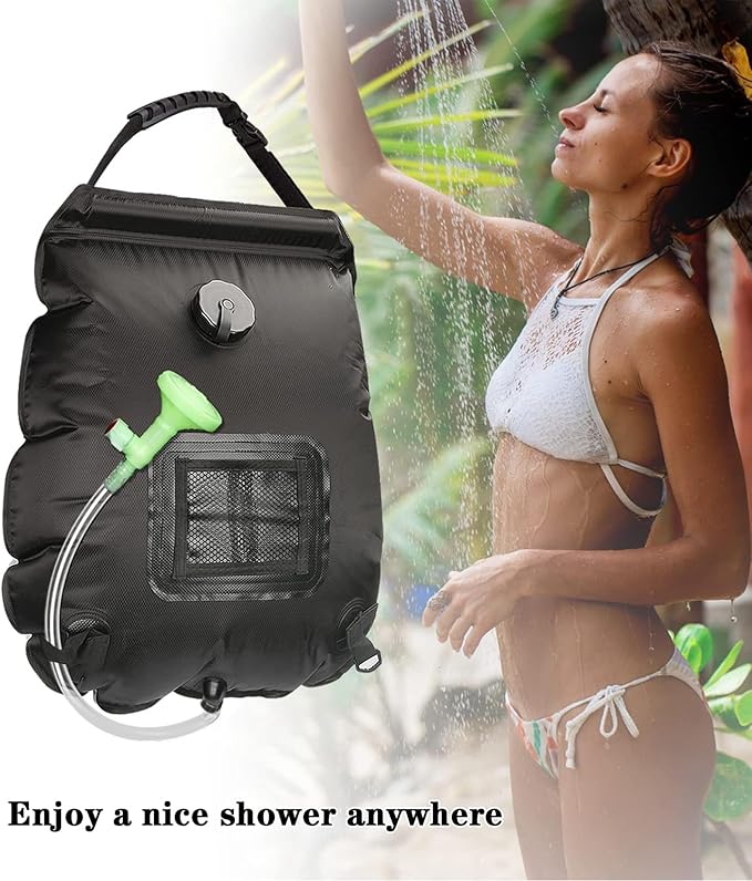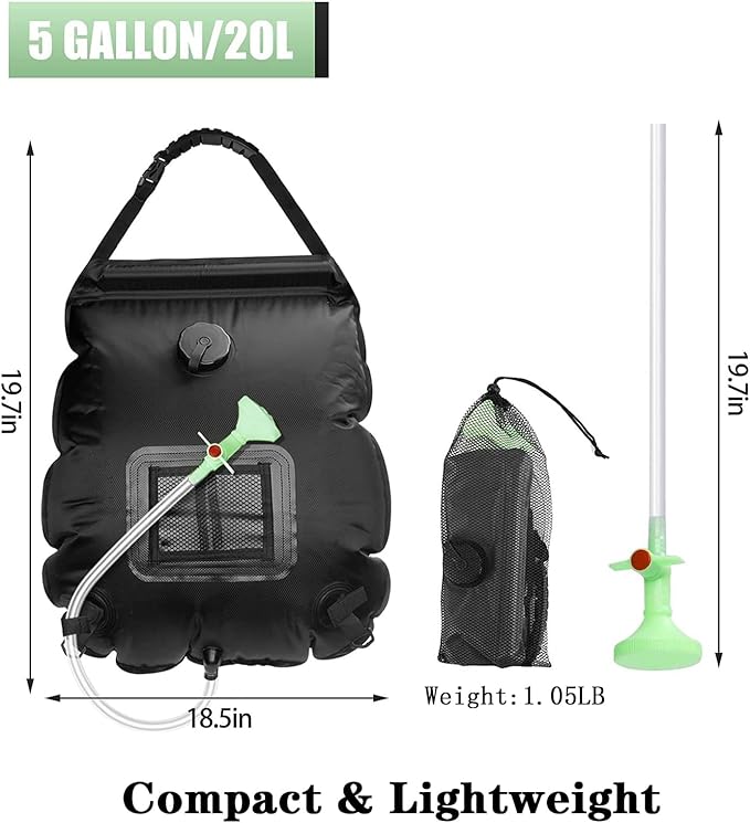 • ★【Compact & Lightweight】 With a larger water capacity of 5 gallons/20L, the solar shower bag is enough for about 3 showers. The water flow is fine and gentle to let you enjoy a better and refreshing shower anywhere, bringing you a better shower experience! Besides, our camping shower is so compact and lightweight that you can carry it in your backpack conveniently. The shower bag is only 0.98 Lbs and just 13x6x2 inches in package.