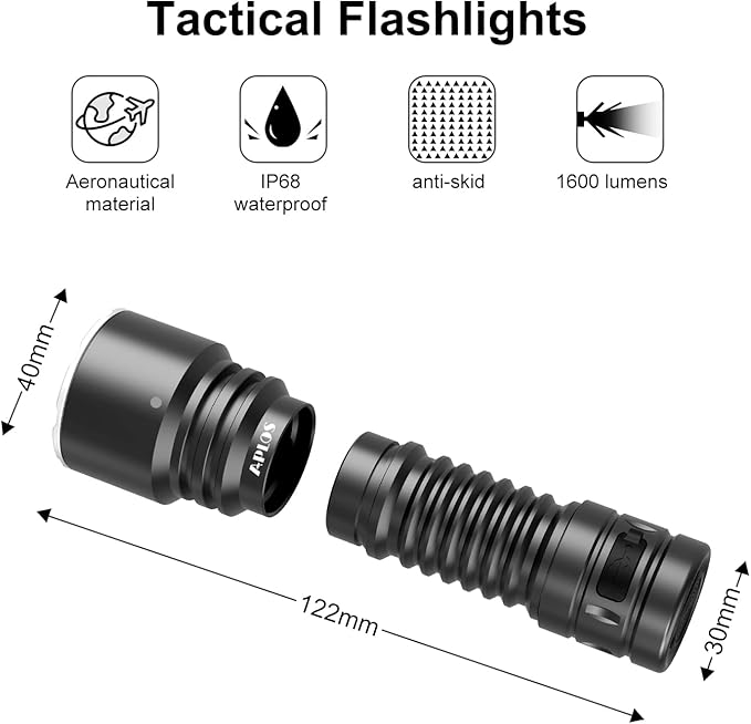 APLOS T04 LED Tactical Flashlight - 1600 Lumen Powerful Emergency Flashlights, 7 Modes IP68 Waterproof Rechargeable Flashlight for Camping Hiking Walking