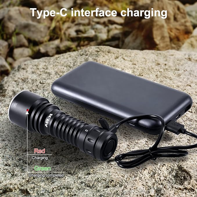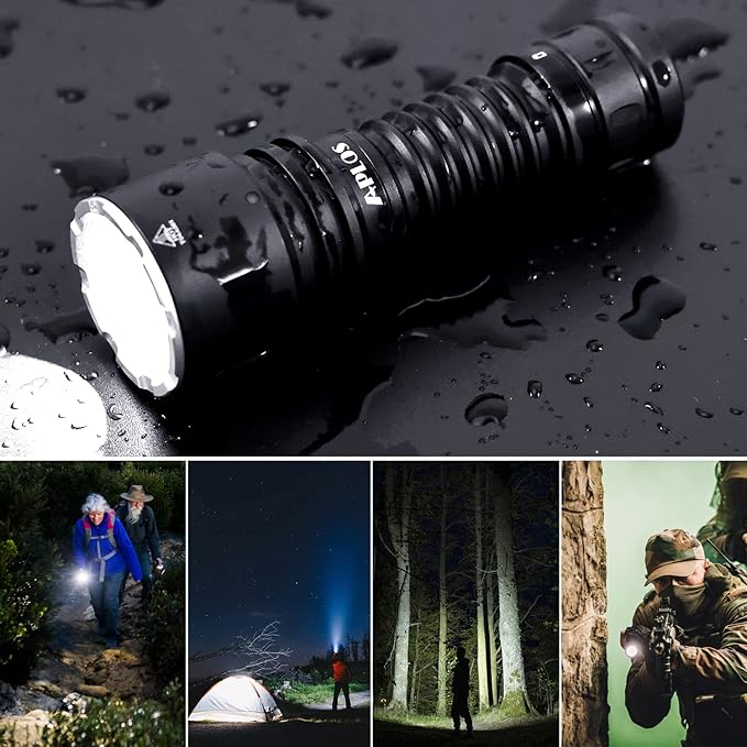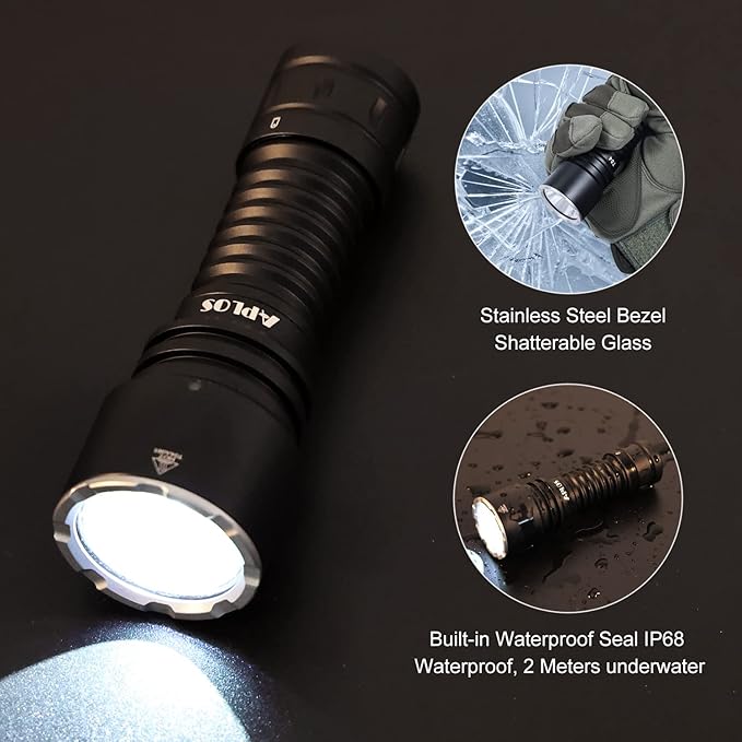 - IP68 Waterproof: The APLOS T04 is rated IP68 for waterproofing, ensuring it can handle extreme weather conditions. Whether it's a sudden downpour or a raging storm, this flashlight will continue to perform, providing you with the light you need when you need it most.
