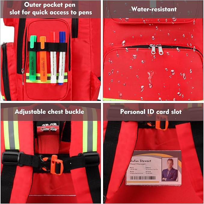 - Weatherproof Warrior: Equipped with a water-resistant coating, our backpack keeps your valuable first aid supplies dry and protected. Rain or shine, your gear remains shielded from moisture, enabling you to respond swiftly to emergencies.