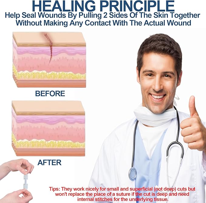 - EASY SUTURE OF CUT & LACERATION - This laceration closure kit is made of hypoallergenic and medical-grade adhesion which can make this wound closure kit simple to apply on the skin, pull wound edges to make fast and easy closure of laceration and keep wound close in place during healing to minimize unnecessary scarring caused by stitches.