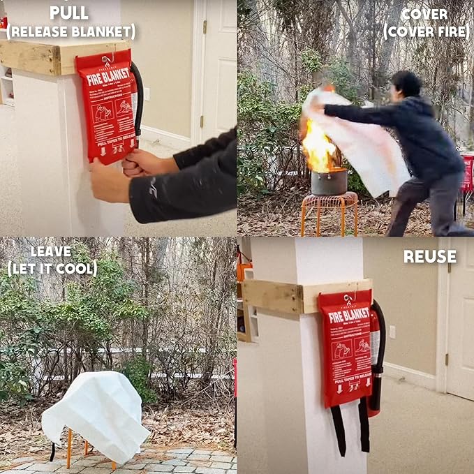 - Fire Blanket. Made from durable, fire-resistant materials, this emergency fire blanket is designed to quickly and easily extinguish small fires caused by oil, grease, or electricity. Measuring 40 x 40 inches, it's the perfect size for effectively covering fire sources and keeping flames under control