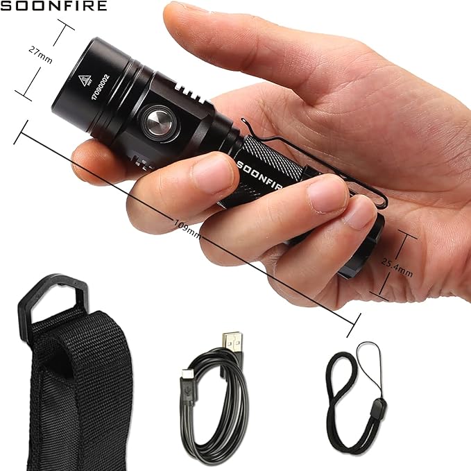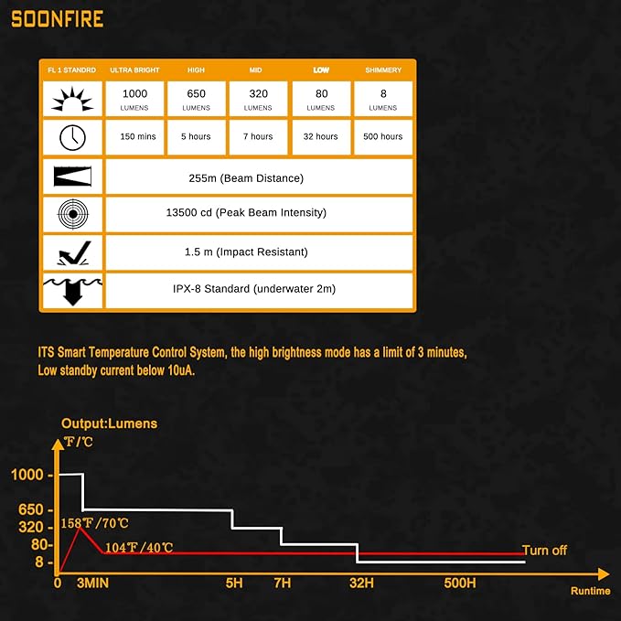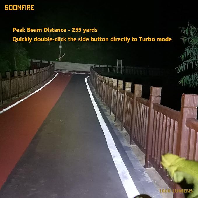 - LONG-LASTING:1000 Lumens max for 131 minutes,Boasts a peak beam intensity of 21,000 CD and a throw distance up to 255 meters,Max Runtime:500 Hours at 8 Lumens.