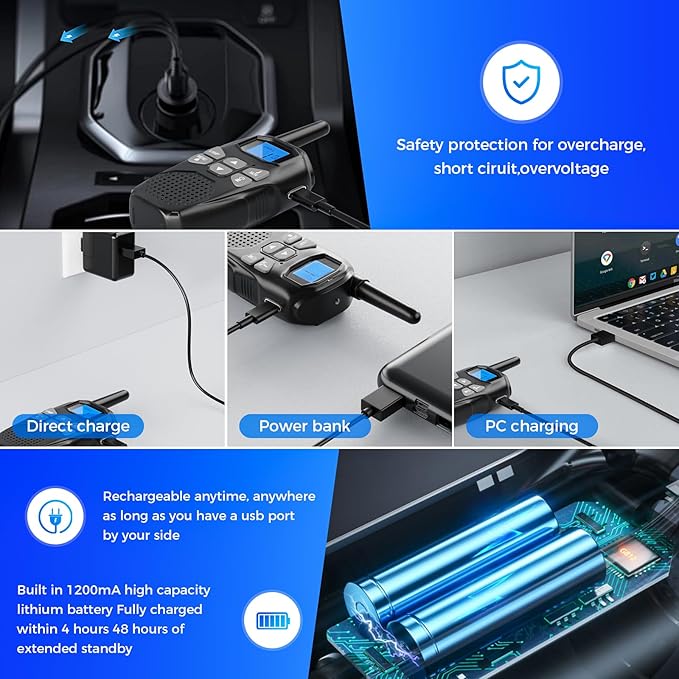 - 【Unlimited Communication Time】The radios walkie talkies support USB cable charging. 4H fast charging, one full charge can stand by for 48 hours. You can charge it indoors, on the road, or even while hiking and camping, and you won't have to pay for batteries again and again, saving you mone.