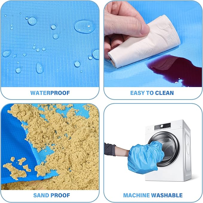 - 🏖️Beach Blanket Waterproof Sandproof:78''×81'' Size beach blanket comfortable fit 1-5 adults,Odorless.Made by parachute fabric,Rip-stop 210T polyester,very light and small after folding,12 oz easy to carry.Small and Mighty!