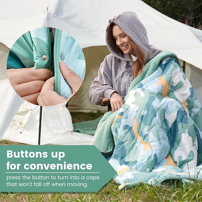 - VERSTILE & FASHIONABLE: This outdoor blanket can be used as a camping blanket, a sleeping bag for children and a picnic mat with the changing of zip and button. Just lay it on the ground or put it up to give it a fashionable explanation. We also welcome you to develop more new ways to use it!