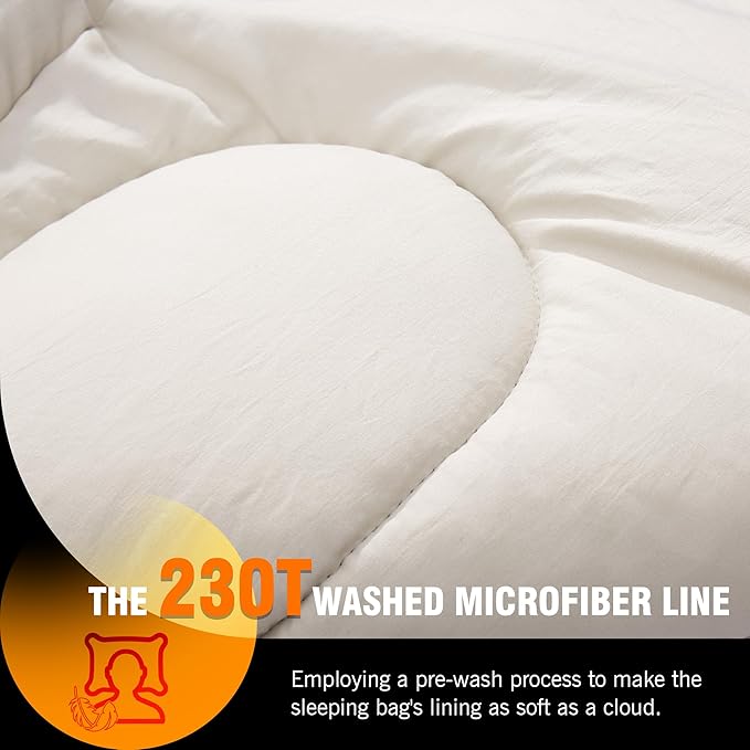 - 【Cotton-like lining】The 230T water-washed ultra-fine fiber fabric is more suitable for campers who prefer a cotton-like feel. It has the texture of cotton but is not as susceptible to dampness, which allows the Harmony Series sleeping bags to still provide some insulation in humid environments.