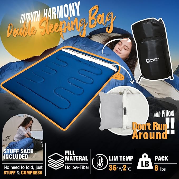 - 【Harmony series】The Harmony series sleeping bag is designed for family or couple car camping, sacrificing portability for enhanced comfort, allowing you to create a cozy sleep system for your loved ones during camping. It also provides a sufficiently comfortable sleeping bags for friends who stay overnight temporarily.Protected by the yotruth Limited Lifetime Warranty.
