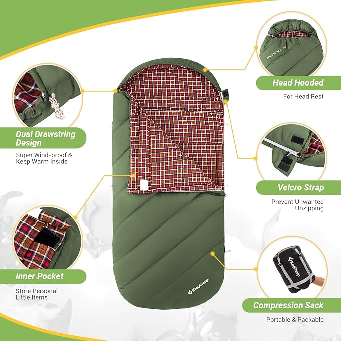 - COZY & SNUG-Your Personal Comfort Zone: Crafted from 100% waterproof and breathable polyester 210T diamond lattice fabric on the outside, and lined with ultra-soft cotton flannel on the inside, this sleeping bag combines durability with comfort. The double-filled design ensures that you stay warm, cozy, and well-rested after a long day of outdoor adventures.