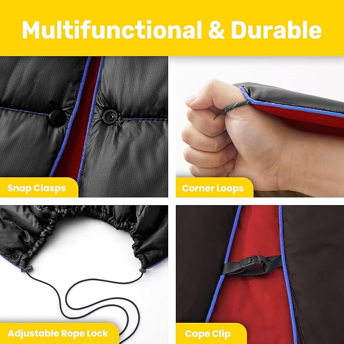 - MULTIFUNCTIONAL - The ultralight packable down alternative puffy camping blanket have corner loops, buttons and elastic straps, this blanket can be used as quilt, poncho, shawl, temporary sleeping bag. allow you to stake the portable blanket into the ground, tent or RV.
