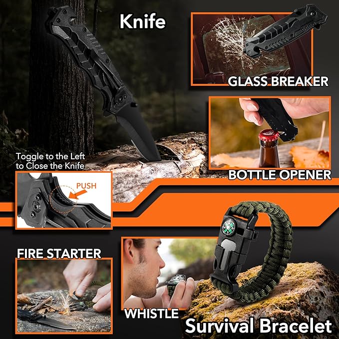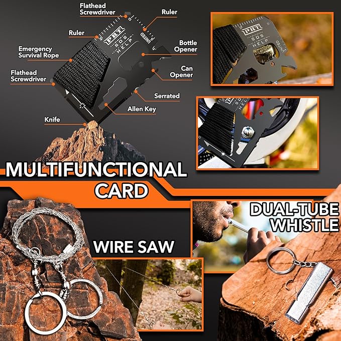 - 21 in 1 Survival Kits, The survival kit contains an exquisite gift box, waterproof box, knife, survival bracelet, flashlight, multifunctional spoon and card, wire saw, whistle, fire starter & ruler, fire starter rope, water bottle clip, carabiner, emergency blanket, tactical pen, keychain screwdriver, fishing equipment kit, compass, parachute cord