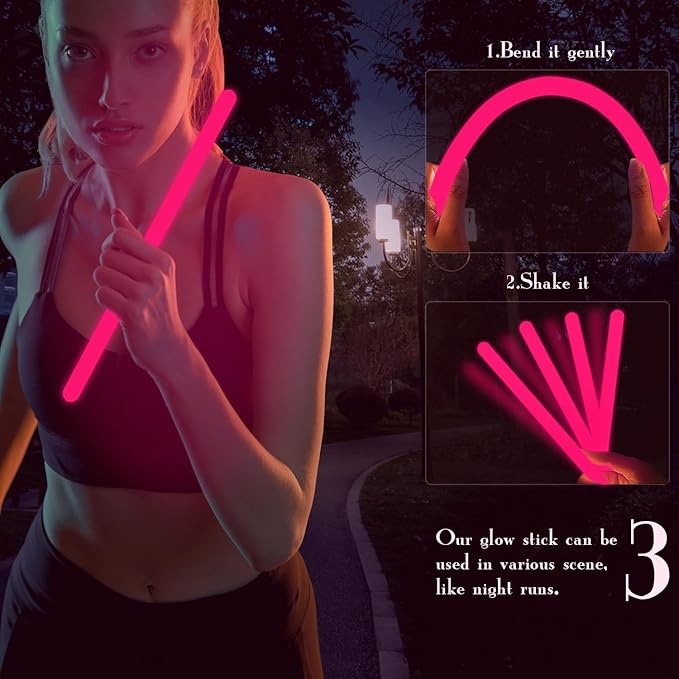 • 【Easy to Use】Gently bend the sticks and shake it firstly,and waiting for the liquid to mix evenly,then these glow sticks will be super bright.Pls be careful and do not bend the stick excessively to avoid liquid leakage.Our glow sticks are sturdy,lightweight,proper size allows you to put them in backpacks,handbags, or luggage, ideal for daily using and travelling