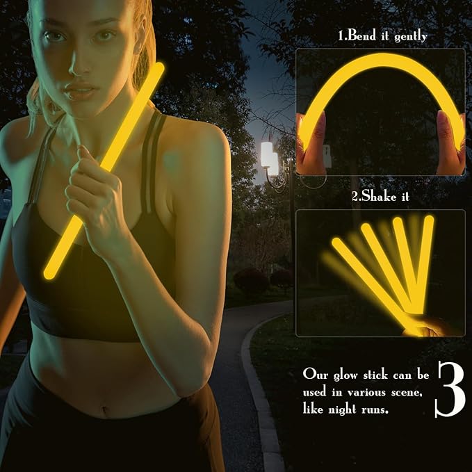 • 【Easy to Use】Gently bend the sticks and shake it firstly,and waiting for the liquid to mix evenly,then these glow sticks will be super bright.Pls be careful and do not bend the stick excessively to avoid liquid leakage.Our glow sticks are sturdy,lightweight,proper size allows you to put them in backpacks,handbags, or luggage, ideal for daily using and travelling
