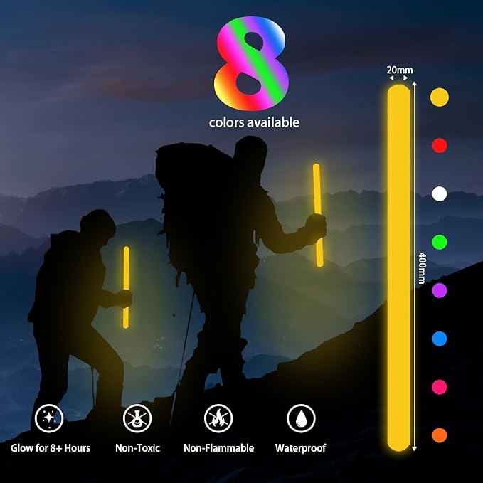 • 【Emergency Lighting Function】Our big glow sticks are military grade bright light sticks,mainly applied for emergency situation.They will provide efficient and reliable lights in power outage,natural disasters(like earthquake,hurricane),or other unexpected situations where electricity may not be available.These light up sticks also are good partners for camping bags, suitable for diving,exploration,camping, night riding, fishing, hiking, field and so on