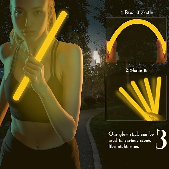 • 【Premium Quality and Sturdy Package】These huge light sticks are made of high- quality blend material,non-toxic,non flammable,not easy to leak and waterproof. They are packaged in a firm cardboard tube to ensure durability and protection from light and heat,sturdy package also will keep the integrity of quality glow sticks and prevents them from activating prematurely. Our glow sticks are safe to use, it’s a good choice for both indoor and outdoor activities