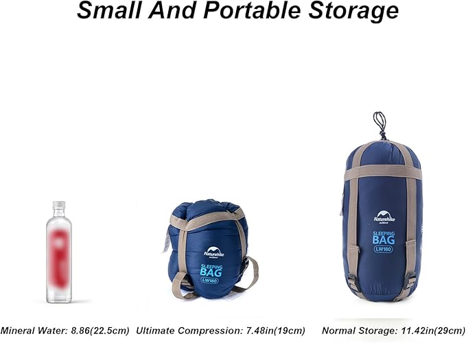 - Ultra-Lightweight and Compact: With a weight of only 2 lbs and a compressed height of just 7.5", the Naturehike Ultralight Compact Sleeping bag is among the lightest and most versatile sleeping bags available. It conveniently packs into the included carrying bag with compact straps, making it easy to transport on all your adventures.