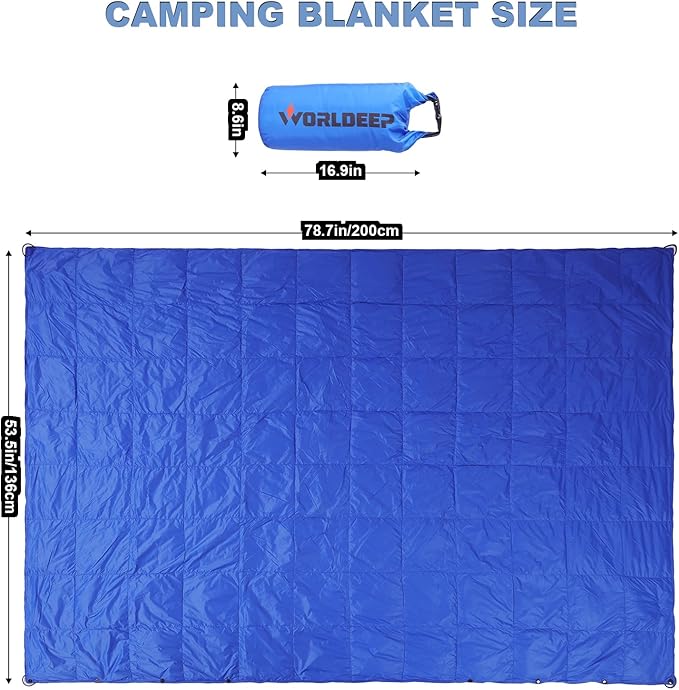 - Warm and Lightweight Camping Blanket: 20D ripstop nylon shell blocks out wind and 650 Fill Power down insulation bring you the most comfortable warmth for your travels. The lightweight camping blanket weighs just 1 pounds. With a normal size of approximately 78.7" x 53.5",it easily accommodates two adults.