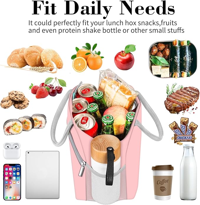 Coobiiya Lunch Bag for Women Men, Insulated Reusable Picnic Bag, 10.8"L x 6.3"W x 8.85"H, Pink