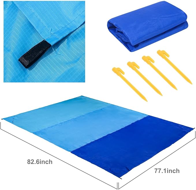 - Everything You Need in One Package. Our blanket comes with 4 ABS Plastic stakes and reinforced anchor loops, as well as 4 corner sand pockets to keep it grounded on windy days. Plus, it comes with a carrying bag for easy storage and transport.