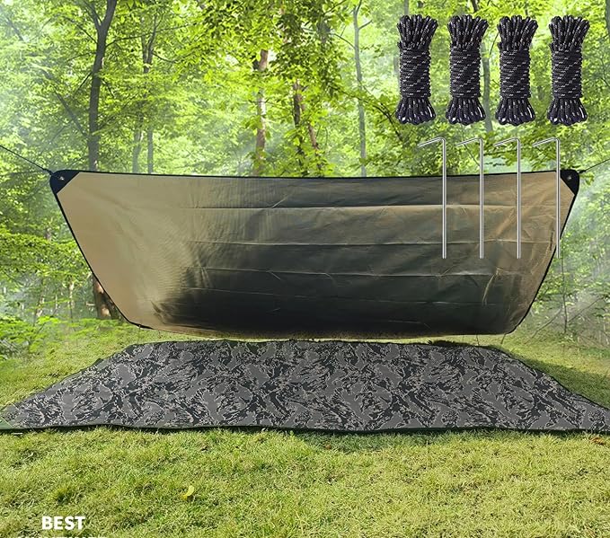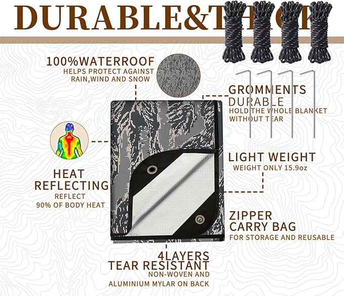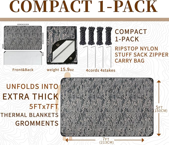 - ONE PACKAGE:1 survival tarp+4 tent stakes+4 tent cords+1 storage bag with draw string.