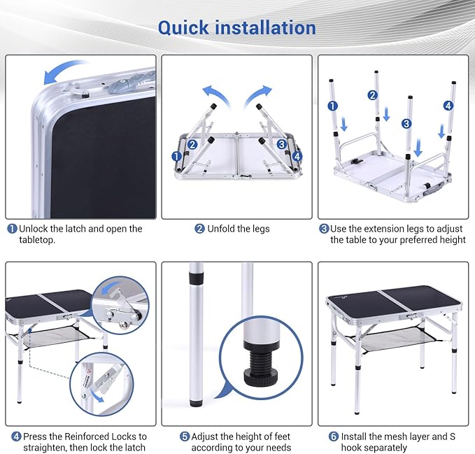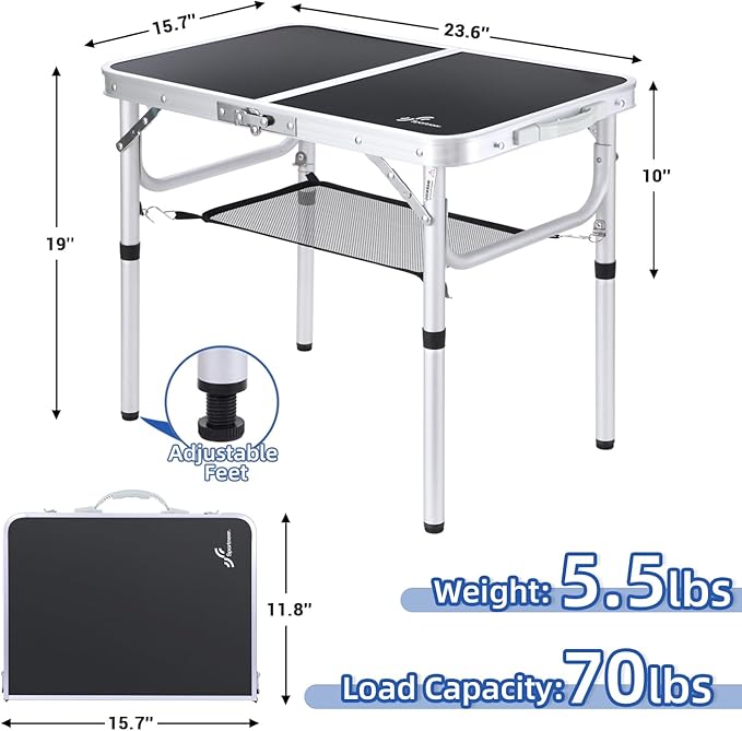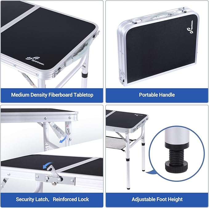 - Compact & Easy to Set Up: Say goodbye to the hassle of poles and complicated setups with the Sportneer adjustable height camping table! Simply open the table, insert the extended legs, secure the locks, and you’re ready to go. Folding down to just 16x12 inches and weighing only 5 lbs, but can support up to 70lbs, making it perfect for any outdoor adventure!