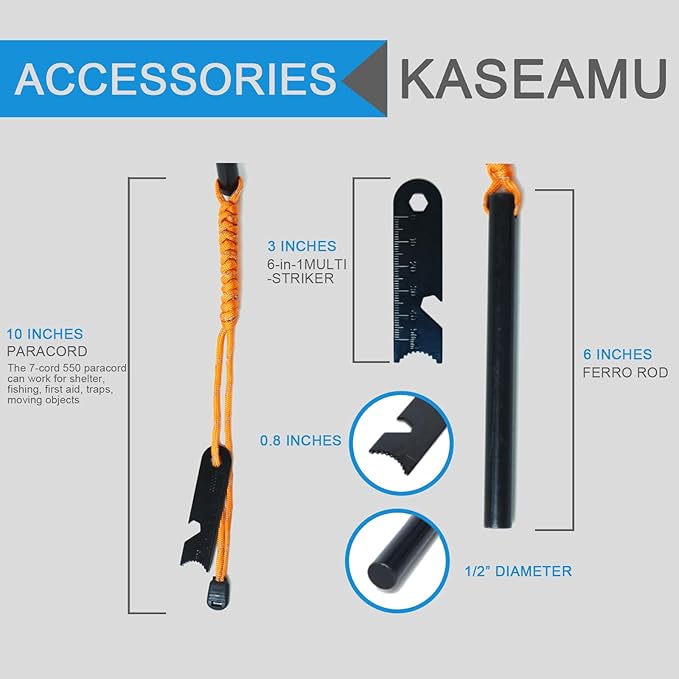 - Included Components : Ferro Rod 1/2 inch x 6 inch, 6-in-1 multi-tool striker, orange paracord lanyard