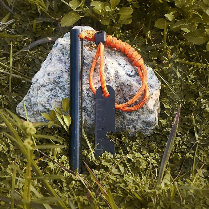 - [Versatile Striker & Paracord] Our Fire Starter Survival Tool include 6-in-1 Striker, which is a versatile tool that can be used for a variety of outdoor tasks, including opening bottles, measuring small distances, map scale, hex wrench etc. And the included 7-cord paracord lanyard can be used for securing gear, tinder, and even as a makeshift fishing line.