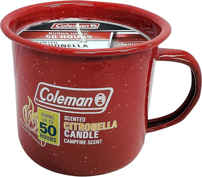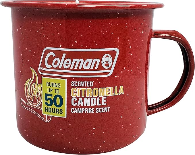 - Campfire scented decorative outdoor citronella candle camping mug, burns up to 50 hours