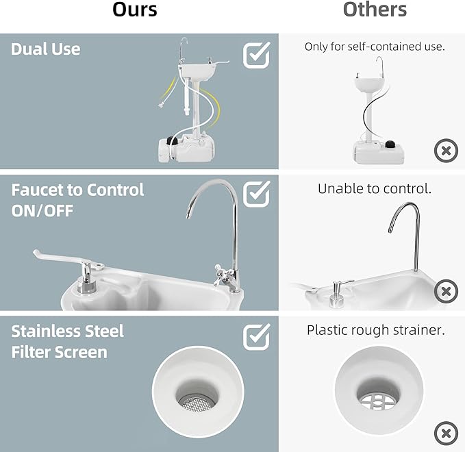 - Dual Use: This portable hand washing station is self-contained with foot pump for camping, and can be connect to a garden hose for a continuous water supply