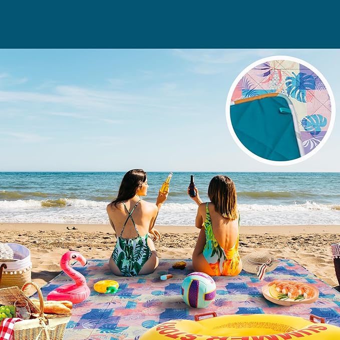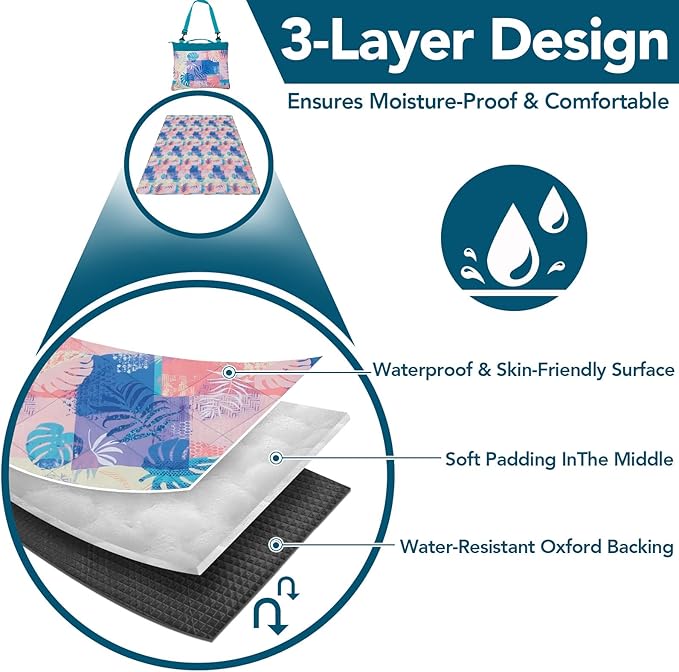 - 【Durable 3-Layer Design】Constructed with 3 layers, sturdy & skin-friendly polyester on top, soft padding in the middle and waterproof Oxford on backing. Thicker design along with 4 corner pockets (can be filled with sand or rocks) will keep our picnic mat grounded against wind, which also offers you extra sitting comfort, unlike other thin beach blankets.