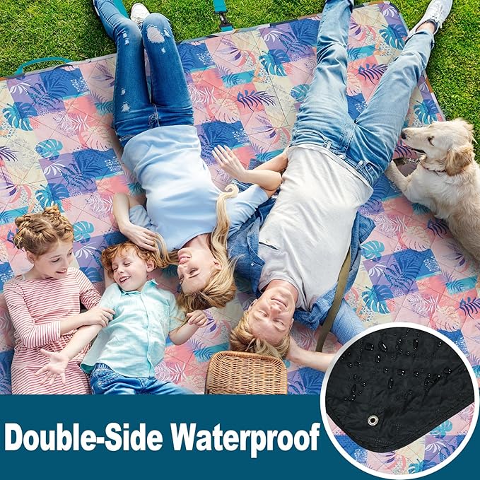- 【Extra Large & Foldable Compactly】This waterproof picnic blanket with unfolding size 73"L x 59"W can comfortably fit up to 4-7 adults, still roomy enough for food & drinks. It is definitely the perfect option for your whole family or friends to enjoy outdoor dining or lounging. Whereas, enhanced Velcro makes the outdoor picnic blanket easily folded into a compact tote, so you can take it anywhere.