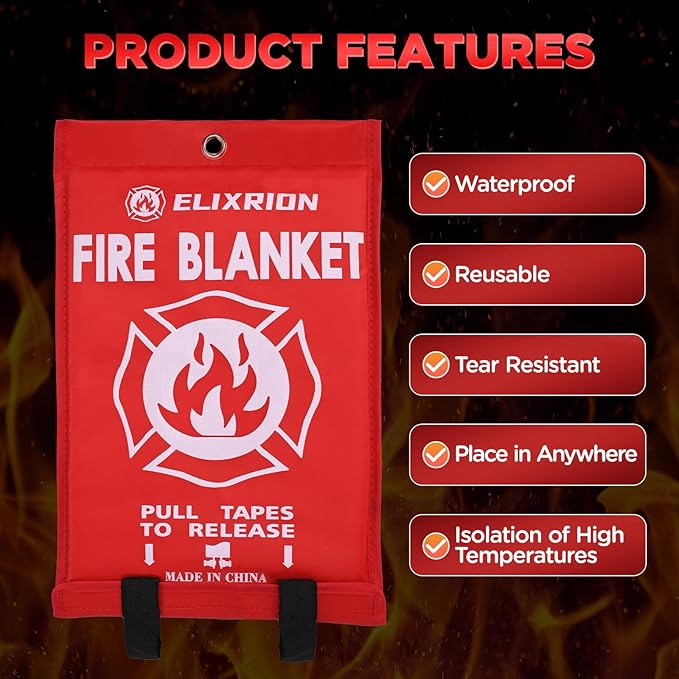 - Fiberglass Material: The Emergency Fire Blanket made of high quality fiberglass and other materials woven by special treatment. They conform to CE safety standards (EN 1896:1997). Composed of two layers of woven fiberglass fabric and an inner layer of fire retardant film. They can isolate high temperatures up to 1076°F (580℃).