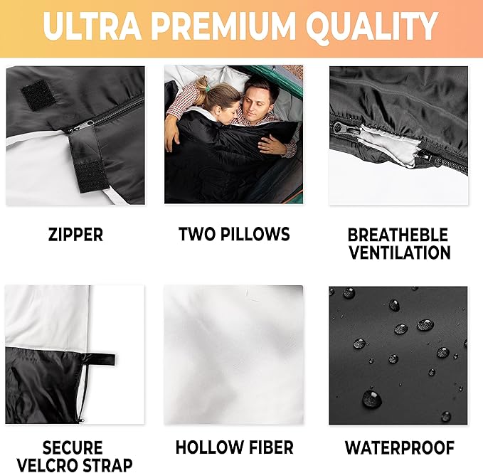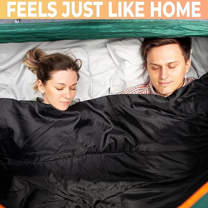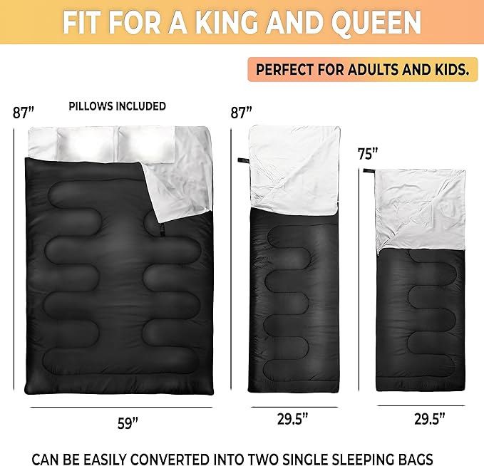 - Dual Size: The sleeping bag is large in size same with a queen size bed but can also be easily converted into two single sleeping bags. Also comes with 2 pillows for added comfort, helping you get an incredible night's rest any place you might be